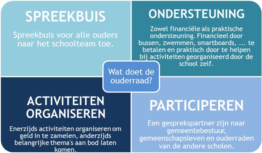 Tevens zorgt zij voor de omkadering van enkele schoolinitiatieven zoals de oudervergaderingen en de infoavond.