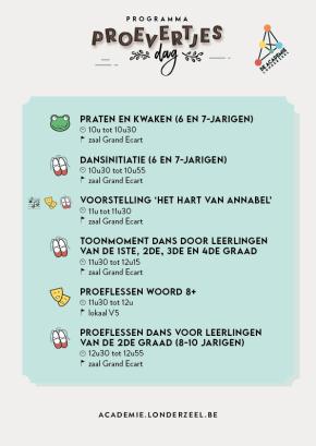 Vanaf 10 uur kan je het volledige aanbod leren kennen. Er worden proeflessen Woord en Dans gegeven