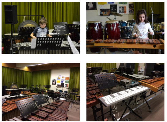 Ons lokaal (G5 - Percussiepaleis) met een uitgebreid assortiment ritmische en melodische slaginstrumenten.
