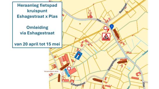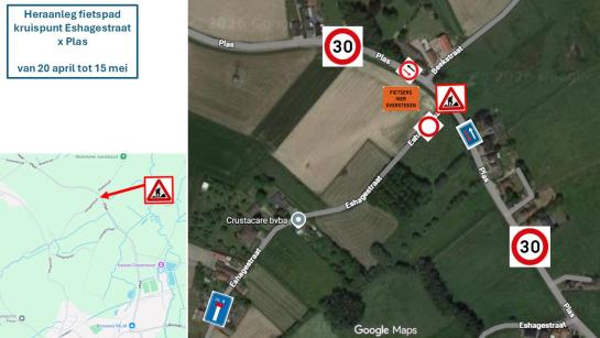Onze gemeentelijke diensten leggen het fietspad en het begin van de Eshagestraat aan het kruispunt met Plas opnieuw aan. Je kan de Eshagestraat niet inrijden. Er is een omleiding via het andere deel van de Eshagestraat en in een gedeelte van Plas geldt tijdelijk een zone 30. Fietsers moeten ter hoogte van de werken oversteken. We verwachten dat de heraanleg afgewerkt is op 15 mei.