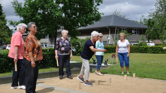 Wekelijks op donderdag bij droog weer een partijtje kubb onder de aanwezigen.