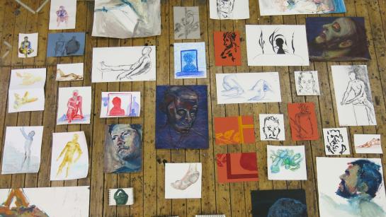 Een diverse verzameling van tekeningen, schetsen en schilderijen toont hun onderzoek, experiment en groei.