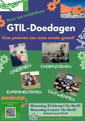 Kom een namiddag proeven van onze eerste graad en schrijf je in voor één van de Doedagen op het GTIL! Deze Doedagen zullen doorgaan op woensdagnamiddag, telkens van 13.00 uur tot 16.30 uur en zij volledig gratis! Jouw ouders kunnen al om 16.00 uur naar de school komen voor een rondleiding.