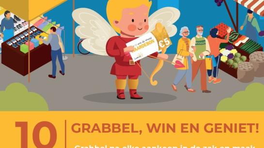 Grabbelen zolang de voorraad strekt. Marktwaardebon geldig vanaf een aankoop van 10 euro bij de vaste markthandelaars op de markt.