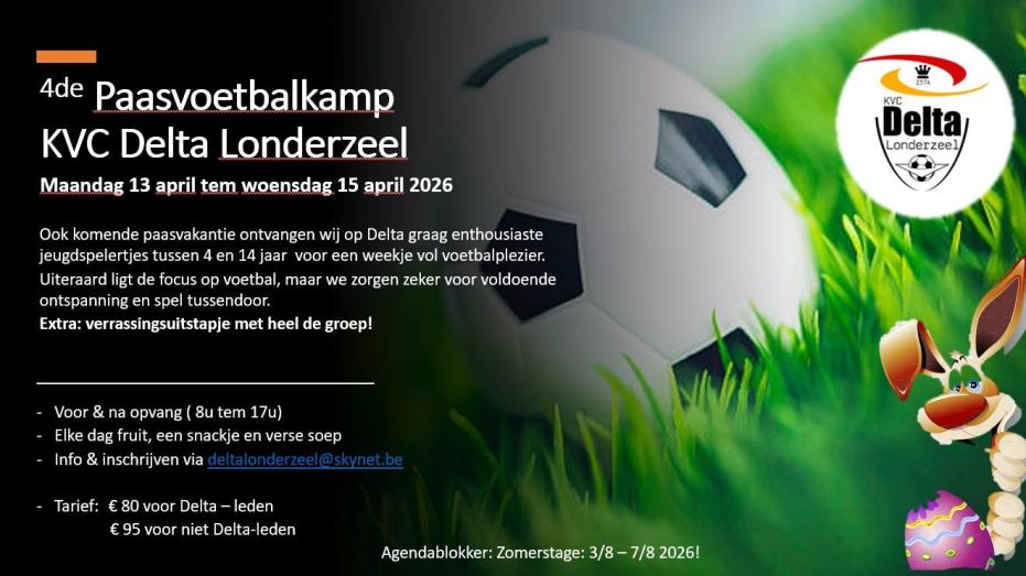 Ook de komende paasvakantie ontvangen we op KVC Delta Londerzeel graag enthousiaste jeugdspelers tussen 4 en 14 jaar voor een weekje vol voetbal/sportplezier. Uiteraard ligt de focus op voetbal, maar ook andere toffe sporten komen aan bod. Extra: uitstapje bowling met heel de groep.