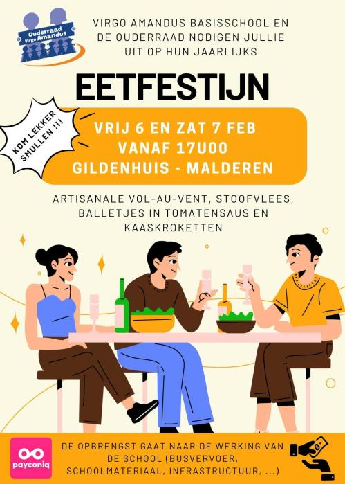 Virgo Amandus basisschool en ouderraad nodigen jullie graag uit op hun jaarlijks eetfestijn. Wij serveren artisanaal gemaakte vol-au-vent, stoofvlees, balletjes in tomatensaus, kaaskroketten en desserts. De opbrengst gaat integraal naar de schoolwerking.