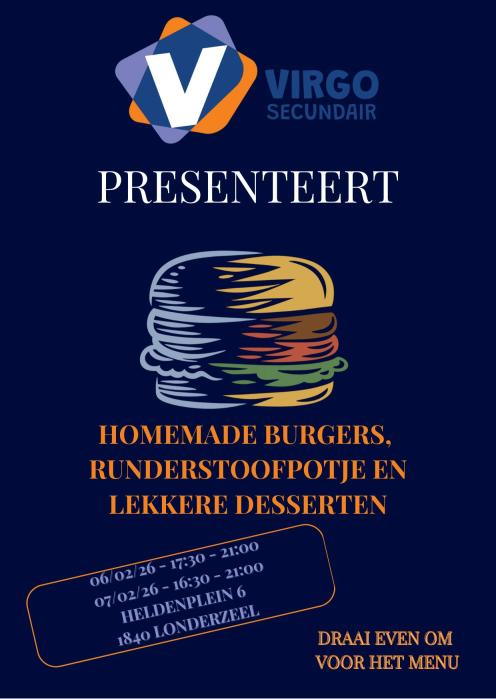 Kom naar het Virgo secundair-schoolrestauarant met homemade burgers, runderstoofpotje en lekkere desserten.